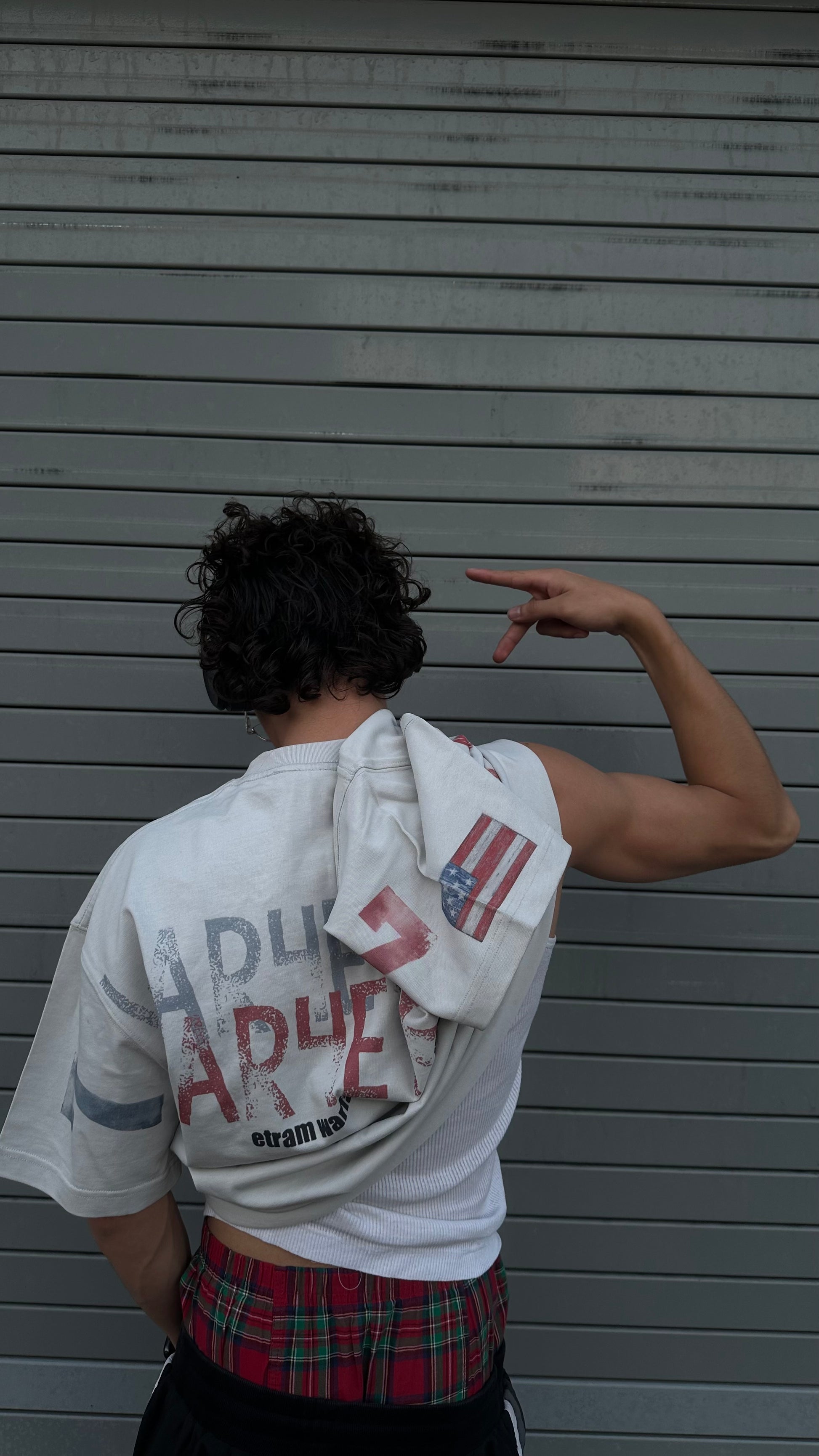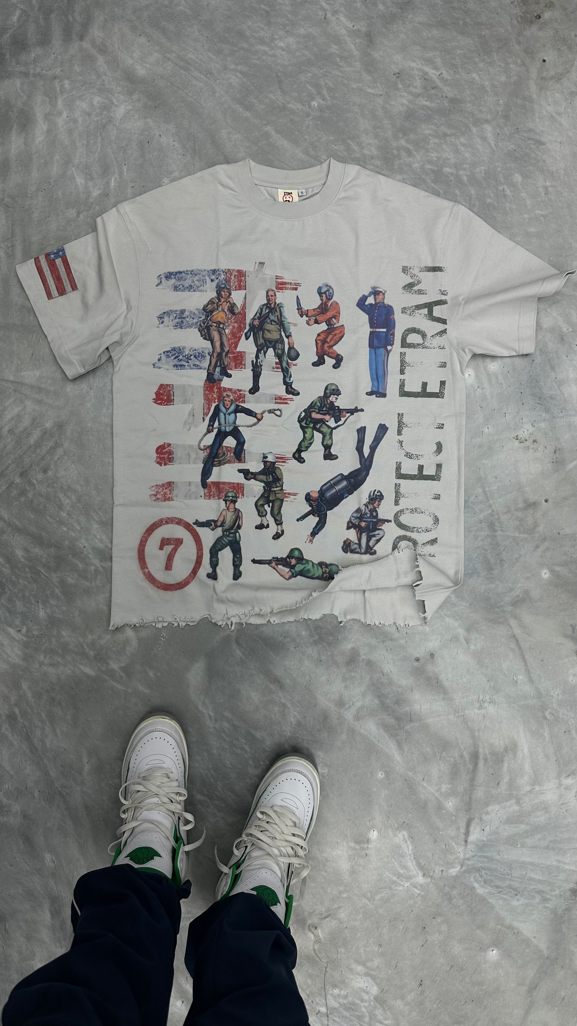 tribute to grit, unity, and the unshakable bonds forged under pressure. This tee showcases a collage of vintage-style military figures each representing a different role, skill, and story lined against a distressed American flag backdrop. battle-worn graphics symbolize resilience, loyalty, and the fight to protect what matters most. Crafted from premium cotton 320 GSM with raw, frayed hems for an authentic, lived in feel, it’s a statement on solidarity and strength in the face of conflict.